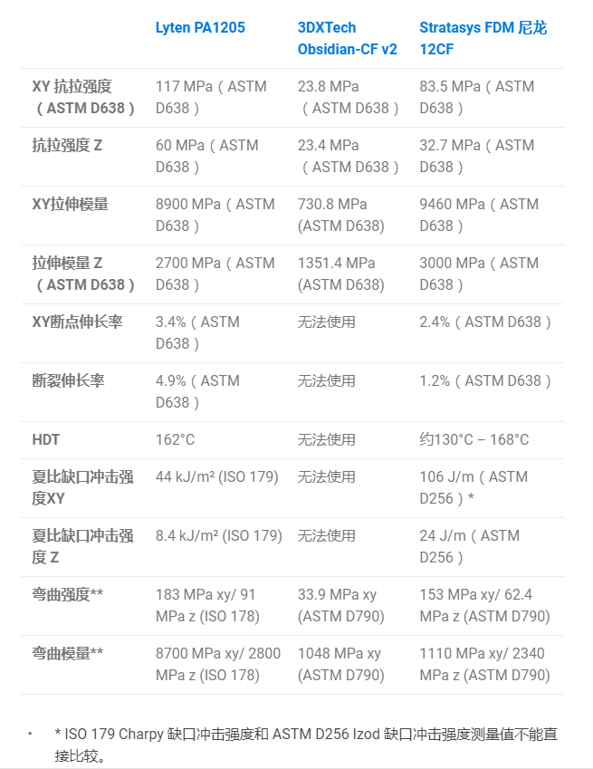 Lyten將PA1205定位為對(duì)重量、耐熱性和機(jī)械可靠性要求極高的應(yīng)用材料。該長(zhǎng)絲的公開(kāi)規(guī)格表明,其熱變形溫度高達(dá)約162°C(例如,Markforged Onyx的熱變形溫度為145°C),密度約為1.08 g/cm3(Markforged Onyx的密度為1.2 g/cm3),使其完全屬于輕質(zhì)高溫工程塑料的范疇。